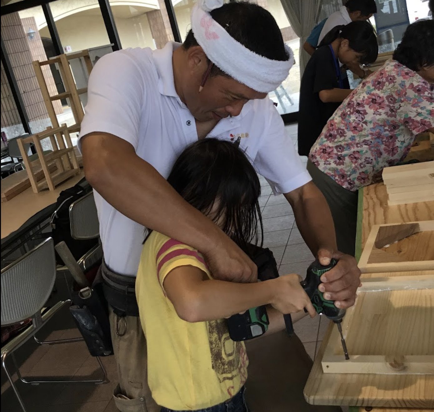 地域の人とテーブル作り。初めてドリルを使うという女の子も上手に製作できました。
